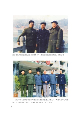 1987 年与河南省公路局副局长王邦杰(中)、新乡县公路局局长刘华山(右)合影 1989 年冬与在辉县考察公路建设的交通部部长潘琪(右三)、辉县市委书记刘廷 (右二)、市长李灿(左三)、交通局局长秦福全(左二)合影 6