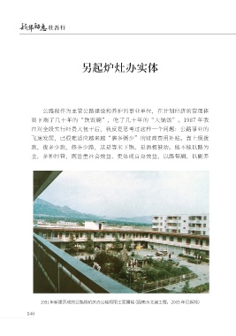 另起炉灶办实体 公路段作为主管公路建设和养护的事业单位,在计划经济的管理体 制下端了几十年的“铁饭碗”,吃了几十年的“大锅饭”。1987 年我 在对全段实行经费大包干后,我反复思考过这样一个问题:公路事业的 飞速发展,已很难适应越来越“僧多粥少”的财政费用补贴。靠上级拨 款,拨多少款,修多少路,这是等米下锅,是消极被动。能不能以路为 主,多种经营,既注重社会效益,更体现自身效益,以路带副,以副养 1991年新建落成的公路段机关办公楼和职工家属楼(因南水北调工程,2009 年已拆除) 140