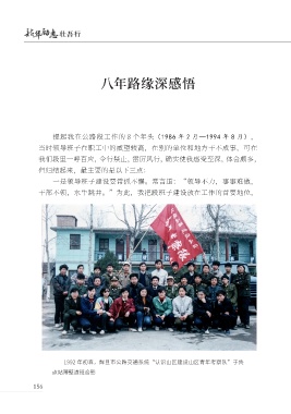 八年路缘深感悟 提起我在公路段工作的 8 个年头(1986 年 2 月—1994 年 8 月), 当时领导班子在职工中的威望较高,在别的单位和地方干不成事,可在 我们段里一呼百应,令行禁止,雷厉风行,确实使我感受至深,体会颇多, 但归结起来,最主要的是以下三点: 一是领导班子建设要常抓不懈。常言道:“领导不力,事事难做, 干部不领,水牛跳井。”为此,我把段班子建设放在工作的首要地位, 1992 年初春,辉县市公路交通系统“认识山区建设山区青年考察队”于终 点站薄壁道班合影 156