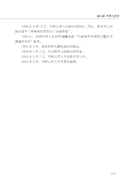 第九章 年表与荣誉 1994 年 8 月 13 日,任辉县市人民政府副市长。同年,新乡市人民 政府授予“河南省优秀青年厂长经理奖”。 1995 年,荣获中华人民共和国建设部“全国城市环境综合整治先 进城市市长”称号。 1995 年 9 月,参加河师大微机班培训结业。 1998 年 1 月 7 日,任卫辉市人民政府副市长。 2003 年 1 月 7 日,任辉县市人大常委会副主任。 2012 年 5 月,从辉县市人大常委会退休。 315