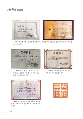 1995 年荣获中华人民共和国建设部“全国城市环境综合治理先进城市市长称号”上图 为证书与奖牌。 1996 年 10 月在“九六·八”抗 1997 年 3 月被新乡市绿化办公室 洪抢险中荣获新乡市委、新乡市人民 评为“城市绿化先进个人”。 政府“先进个人二等奖”。 1998 年 3 月被河南省建设项目执法监 察领导小组评为“建设项目执法监察先进工 作者”。 322