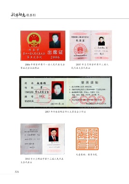 2006 年辉县市第十一届人民代表大会 2007 年 2 月辉县市第十二届人 第五次会议出席证 民代表大会代表证 2007 年河南省辉县市人大常委会工作证 九叠篆刻:躬身为民 2012 年 4 月辉县市第十三届人民代表 大会代表证 326