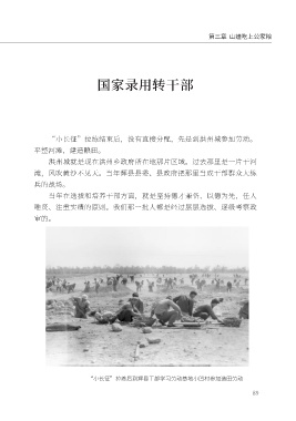 第三章 山娃吃上公家粮 国家录用转干部 “小长征”拉练结束后,没有直接分配,先是到洪州城参加劳动。 平整河滩,建造粮田。 洪州城就是现在洪州乡政府所在地那片区域。过去那里是一片干河 滩,风吹黄沙不见天。当年辉县县委、县政府把那里当成干部群众大练 兵的战场。 当年在选拔和培养干部方面,就是坚持德才兼备、以德为先,任人 唯贤、注重实绩的原则。我们那一批人都是经过层层选拔、逐级考察政 审的。 “小长征”拉练后到辉县干部学习劳动基地小凹村参加造田劳动 89